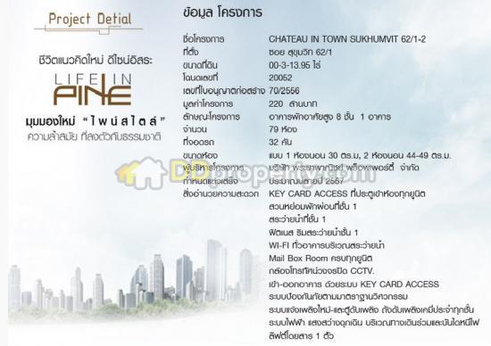 ชาโตว์ อินทาวน์ สุขุมวิท 62/1 เฟส 2 คอนโดมิเนียม ธรรมชาติโอบล้อมชีวิต แนวคิด Life in PINE จัดงาน PRE-SALE เปิดจองห้องสวยและวิวดีที่สุด เป็นอาคารสูง 8 ชั้น มีทั้งหมด 79 ยูนิต มีทั้งแบบ 1 ห้องนอน 2 ห้องนอน