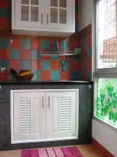 *แยกห้องครัวเป็นสัดส่วน ชุดครัว BUILT-IN อยู่ที่ระเบียง ในครัวมีตู้แขวน 1 ชุดและชั้นวางของ ตู้ใต้ SINK มีบานปิด 1 ชุด , ปลั๊กที่ระเบียงสำหรับเครื่องซักผ้าสามารถวางเครื่องซักผ้าส่วนตัวได้