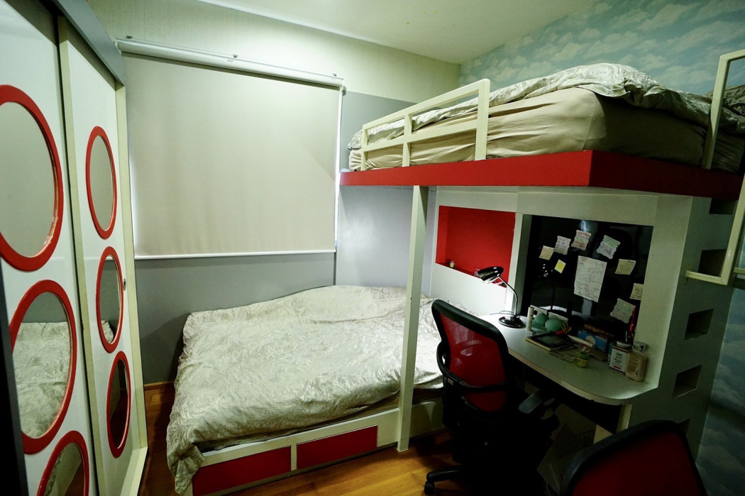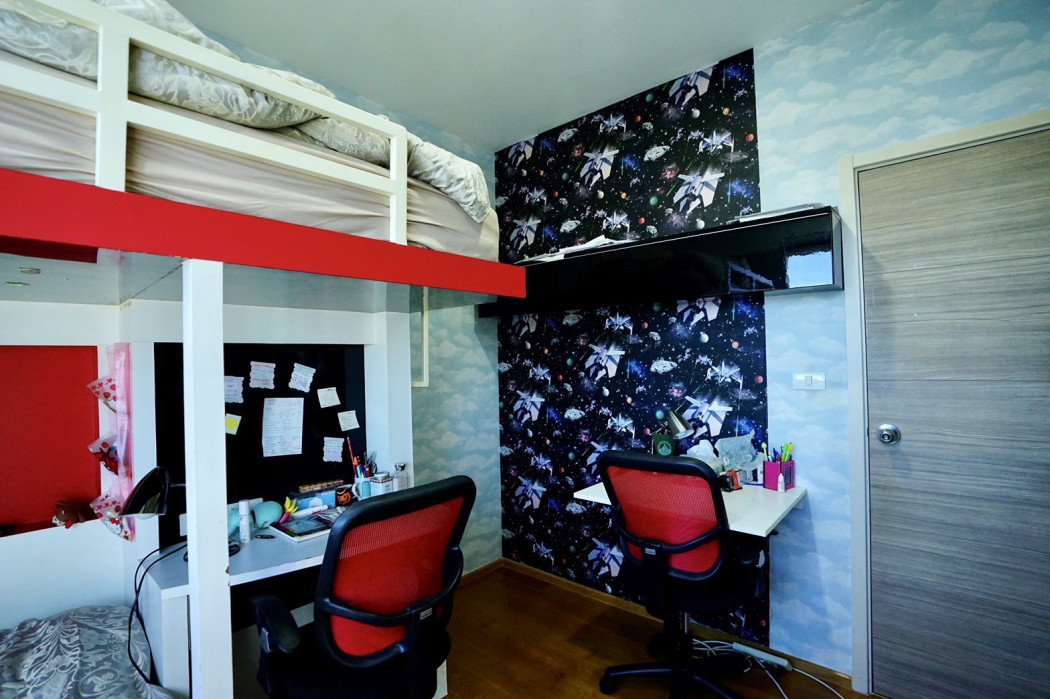 - ห้องนอนเล็ก เตียง3.5ฟุต 2 เตียง ตกแต่งด้วย wallpapers เกรดดี