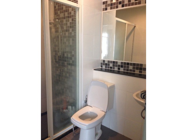 พื้นลามิเนตอย่างดี กันน้ำ กันปลวก ห้องน้ำพร้อมด้วยกรอบอลูมิเนียมอบขาว ห้องน้ำกั้นเปียกแห้งด้วย กระจก TEMPER บานสไลด์พร้อมกรอบอลูมิเนียมอบขาวเข้าชุดกับด้านนอก