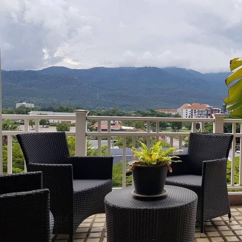 Lระเบียงขนาดใหญ่พร้อมวิวดอยสุเทพแบบไร้สิ่งบดบัง ครบครันด้วยเก้าอี้อาบแดดแบบสบายๆ พื้นที่มากมายสำหรับสังสรรค์กับเพื่อนฝูง